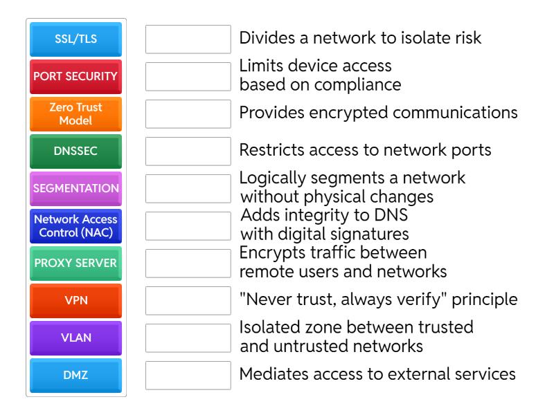 DMZ - Isolated zone between trusted and untrusted networks, VLAN - Logically segments a network without physical changes, VPN - Encrypts traffic between remote users and networks, PROXY SERVER - Mediates access to external services, Zero Trust Model - "Never trust, always verify" principle, Network Access Control (NAC) - Limits device access based on compliance, DNSSEC - Adds integrity to DNS with digital signatures, SSL/TLS - Provides encrypted communications, PORT SECURITY - Restricts access to network ports, SEGMENTATION - Divides a network to isolate risk,