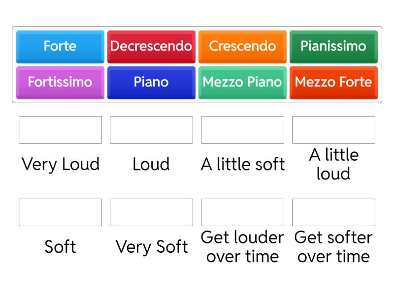 Forte - Loud, Piano - Soft, Mezzo Forte - A little loud, Pianissimo - Very Soft, Fortissimo - Very Loud, Mezzo Piano - A little soft, Decrescendo - Get softer over time, Crescendo - Get louder over time,