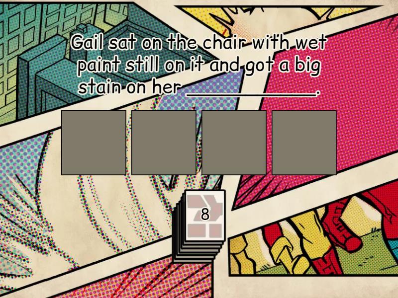1) Gail sat on the chair with wet paint still on it and got a big stain on her ___________. a) brain b) chain c) pants d) rain 2) It is a pain to have to wait for the last ______________. a) grain b) train c) snail d) faith 3) The quaint home was up on a hill, almost past the ______________ gate. a) brain b) tail c) wait d) main 4) Mrs. Bond almost lost her gold chain in the sink _________________. a) brain b) stain c) drain d) tail 5) The plain maid did not want to wait for the __________________ to take her to Spain. a) airplane b) membrane c) saint d) faint 6) If you braid your hair in the rain it won't get _____________ in it. a) nots b) knots c) snot d) wrots 7) I get paid on the last Friday of the ______________. a) women b) stain c) main d) month 8) Daisy Duck is not as ___________ as Quackers. a) paid b) aid c) cute d) cut 9) Will you please ______________________ how you did that math problem a) complain b) explain c) contain d) raisin 10) I love chocolate ____________ in my popcorn a) brains b) sprains c) raisins d) snails