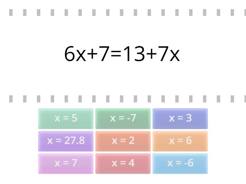 x = -6 - 6x+7=13+7x, x = 4 - 13−4x=1−x, x = 6 - 7x−3=3+6x, x = -7 - −3+5x=4x−10, x = 7 - 4x+8=−13+7x, x = 3 - x+3=−6+4x, x = 5, x = 2, x = 27.8,
