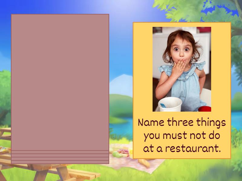 Name three things you have to do to stay healthy. , Name three things you have to do in classes. , Name three things you must not do at a restaurant., Name three things you can do when you're on vacation. , Name something you don't have to do in a cinema. , Name something you must do at work..