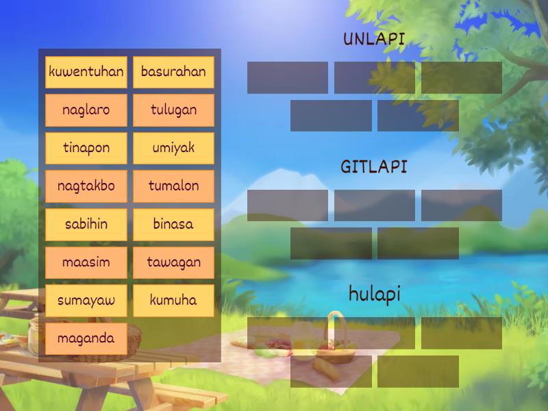 UNLAPI: maganda, maasim, naglaro, umiyak, nagtakbo, GITLAPI: kumuha, tumalon , sumayaw, tinapon, binasa, hulapi: basurahan, tawagan, sabihin, tulugan, kuwentuhan,