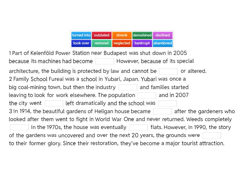 1 Part of Kelenföld Power Station near Budapest was shut down in 2005 because its machines had become ____ However, because of its special architecture, the building is protected by law and cannot be ____ or altered. 2 Family School Fureai was a school in Yubari, Japan. Yubari was once a big coal-mining town, but then the industry ____ and families started leaving to look for work elsewhere. The population ____ and in 2007 the city went ____ left dramatically and the school was ____ 3 In 1914, the beautiful gardens of Heligan house became ____ after the gardeners who looked after them went to fight in World War One and never returned. Weeds completely ____ In the 1970s, the house was eventually ____ flats. However, in 1990, the story of the gardens was uncovered and over the next 20 years, the grounds were ____ to their former glory. Since their restoration, they've become a major tourist attraction.