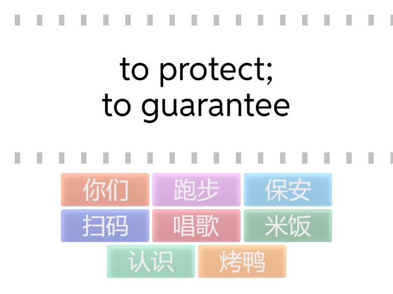 保安 - to protect; to guarantee, 唱歌 - to sing, 烤鸭 - to roast; to bake, 米饭 - rice; meal, 跑步 - to run, 扫码 - to sweep, 认识 - to recognize; to admit, 你们 - you,