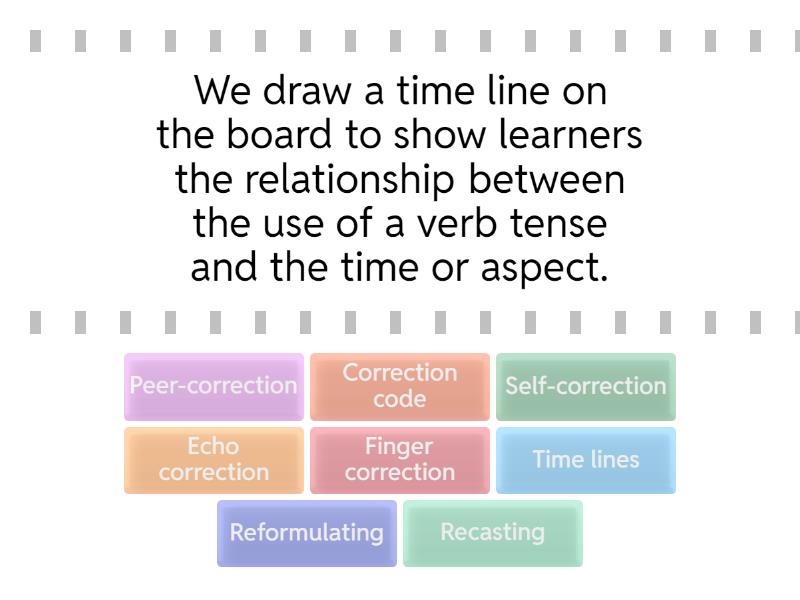 Time lines - We draw a time line on the board to show learners the relationship between the use of a verb tense and the time or aspect., Finger correction - This shows learners where in an utterance they have made a mistake. , Echo correction - Means repeating what a learner says with rising intonation., Self-correction - When learners correct their own mistakes, Peer-correction - involves learners correcting each other's mistakes, Reformulating - is a technique which parents use when their young children make language mistakes by repeating utterance correctly., Recasting - rewording and saying student's utterance in its improved form., Correction code - indicate the type of mistakes that the learner has made.,