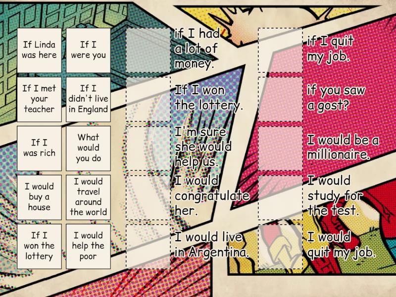 If I won the lottery - I would be a millionaire., If I was rich - I would quit my job., I would travel around the world  - if I quit my job., I would help the poor - if I had a lot of money., If I were you - I would study for the test., If I met your teacher - I would congratulate her., If I didn't live in England - I would live in Argentina., If Linda was here - I'm sure she would help us., What would you do - if you saw a gost?, I would buy a house - If I won the lottery.,