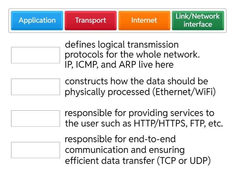 Link/Network interface - constructs how the data should be physically processed (Ethernet/WiFi), Internet - defines logical transmission protocols for the whole network. IP, ICMP, and ARP live here, Transport - responsible for end-to-end communication and ensuring efficient data transfer (TCP or UDP), Application - responsible for providing services to the user such as HTTP/HTTPS, FTP, etc.,