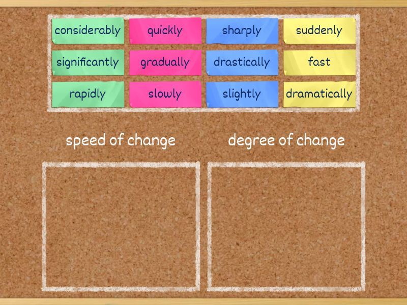 speed of change: sharply, fast, quickly, gradually, suddenly, slowly, rapidly, degree of change: slightly, dramatically, significantly, drastically, considerably,