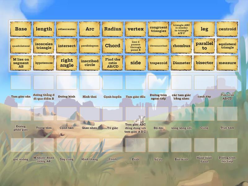 measure - Số đo, side - Cạnh, right angle - góc vuông, parallel to - song song với, congruent triangles - các tam giác bằng nhau, M lies on segment AB - M thuộc đoạn thẳng AB, line d passes through point B - đường thẳng d đi qua điểm B, triangle ABC is similar to triangle A'B'C' - Tam giác ABC đồng dạng với tam giác A'B'C', Find the ratio AB/CD - Tìm tỉ số AB/CD, length - Độ dài, intersect - Giao nhau, trapezoid - Hình thang, parallelogram - HÌnh bình hành, rhombus - Hình thoi, bisector - Đường phân giác, centroid - Trọng tâm, othercenter - Trực tâm, vertex - Đỉnh, leg - Cạnh bên, hypotenuse - Cạnh huyền, Base - cạnh đáy, isosceles triangle - Tam giác cân, equilateral triangle - Tam giác đều, quadrilateral - Tứ giác, inscribed circle - Đường tròn nội tiếp, Circumscribed - Đường tròn ngoại tiếp, Radius - Bán kính, Diameter - Đường kính, Chord - Dây cung, Arc - Cung,