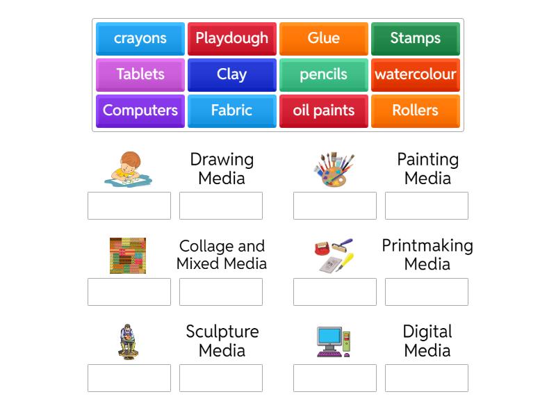 Drawing Media: pencils, crayons, Painting Media: watercolour, oil paints, Collage and Mixed Media: Fabric, Glue, Printmaking Media: Stamps, Rollers, Sculpture Media: Clay, Playdough, Digital Media: Tablets, Computers,