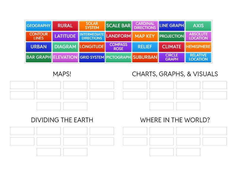 MAPS!: COMPASS ROSE, CARDINAL DIRECTIONS, INTERMEDIATE DIRECTIONS, MAP KEY, SCALE BAR, PROJECTION, CONTOUR LINES, RELIEF, CHARTS, GRAPHS, & VISUALS: BAR GRAPH, CIRCLE GRAPH, DIAGRAM, LINE GRAPH, PICTOGRAPH, DIVIDING THE EARTH: AXIS, GRID SYSTEM, HEMISPHERE, LATITUDE, LONGITUDE, WHERE IN THE WORLD? : ABSOLUTE LOCATION, ELEVATION, GEOGRAPHY, CLIMATE, LANDFORM, RELATIVE LOCATION, SUBURBAN, URBAN, RURAL, SOLAR SYSTEM,