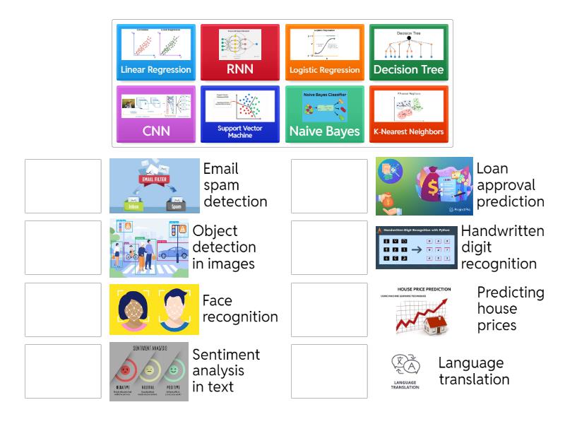 Linear Regression - Predicting house prices, Logistic Regression - Email spam detection, Decision Tree - Loan approval prediction, K‑Nearest Neighbors - Handwritten digit recognition, RNN  - Language translation, CNN - Object detection in images, Support Vector Machine - Face recognition, Naive Bayes - Sentiment analysis in text,