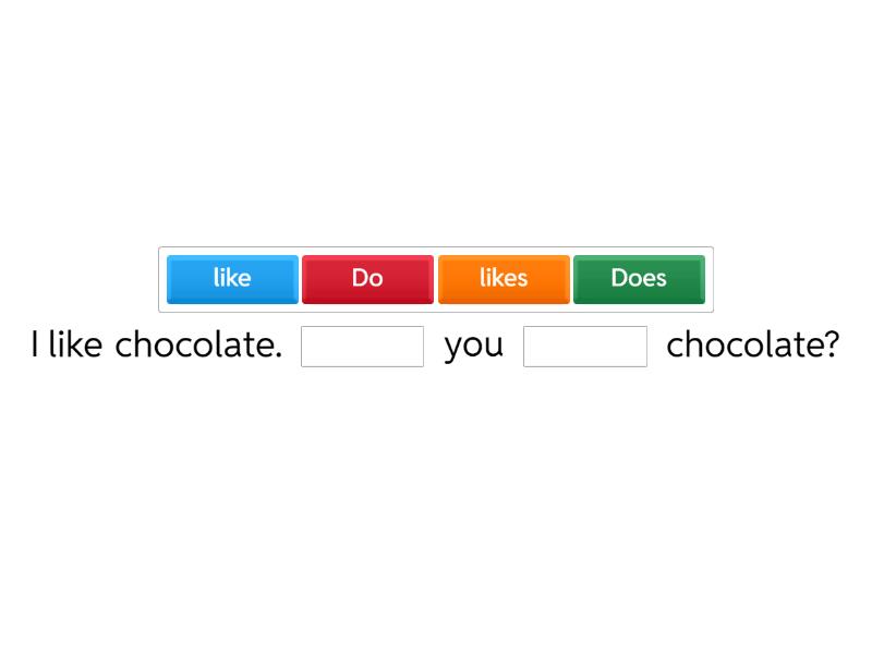 I like chocolate. ____ you ____ chocolate? She lives in Bradford. ____ he ____ in Bradford too? They study English every Friday. ____ you ____ on Fridays too? She ____ not eat pork. Do you ____ pork? We go to the gym on Mondays. ____ he ____ to the gym too? They ____ not like cabbage. Do you ____ it? I ____ not understand. Do you ____? She does not ____ by bus. ____ he come by bus? They ____ not like their teacher. Do you ____ your teacher? He ____ work at 5 o'clock. ____ she finish at 5 o'clock too?