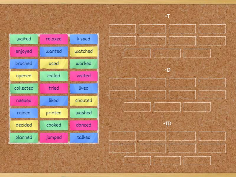 -T: liked, talked, cooked, brushed, danced, relaxed, watched, worked, washed, kissed, jumped, -D: rained, used, planned, opened, enjoyed, called, lived, tried, -ID: decided, printed, wanted, visited, collected, waited, shouted, needed,