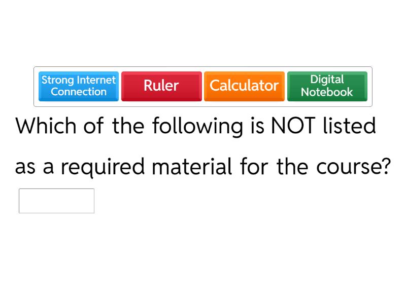 Which of the following is NOT listed as a required material for the course? ____ What is the maximum number of days allowed for late work submission? ____ Which platform should parents use to view final grades? ____ What grade range represents a "B" in this course? ____ What percentage is deducted each day for late assignments? ____ Which of the following is NOT an acceptable excuse for turning off the camera during class? ____ What happens on the first academic integrity violation? ____ How many school days do students have to complete make-up work after an excused absence? ____ What is the weight of Assignments (Classwork) in the final grade calculation? ____ What percentage of class time must a student be visible on camera to be marked present? ____ According to the attendance policy, what happens if a student accumulates ten consecutive absences? ____ What digital platform is used as the main interactive tool for lessons and feedback? ____