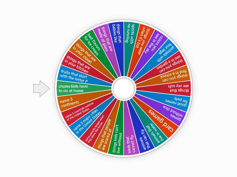 1) fruits that start with the letter P 2) things that are in your kitchen 3) things that are in your closet 4) bad flavors for ice cream 5) things that are made of glass 6) things that babies like 7) sports with no running 8) things you wear when it's hot 9) colors you see in the sky 10) animals with four legs 11) things you can see in a garden 12) things you can find in a school 13) things that are vey soft 14) good names for pets 15) games without dice 16) card games 17) animals that live in water 18) animals that can fly 19) birds that cannot fly 20) things kids can't live without 21) things that people are scared of 22) items parents forget when they leave the house 23) name 3 major cities in the United States 24) name 3 countries outside of the United States 25) name 3 continents 26) chores kids have to do at home
