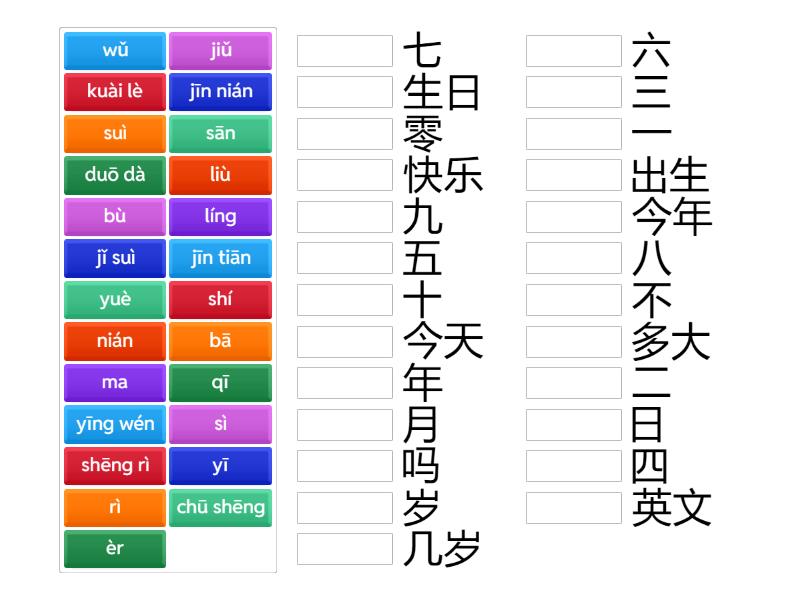 nián - 年, chū shēng - 出生, jīn tiān - 今天, yuè - 月, rì - 日, shēng rì - 生日, jīn nián - 今年, suì - 岁, líng - 零, yī - 一, èr - 二, sān - 三, sì - 四, wǔ - 五, liù - 六, qī - 七, bā - 八, jiǔ - 九, shí - 十, ma - 吗, bù - 不, yīng wén - 英文, kuài lè - 快乐, jǐ suì - 几岁, duō dà - 多大,