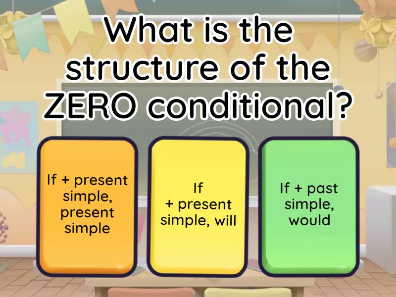 1) What is the structure of the ZERO conditional? a) If + present simple, present simple b) If + present simple, will c) If + past simple, would 2) Which is an example of the ZERO conditional? a) If I drink this coffee now, I won't sleep well. b) If I drink coffee late, I don't sleep well. c) If I drank coffee now, I wouldn't sleep well. 3) We use the ZERO conditional for: a) Things that never happen b) Things that can happen c) Things that always/usually happen 4) Which sentence shows the FIRST conditional? a) If it rains heavily, my street floods. b) If it rained heavily today, my street would flood. c) If it rains heavily today, my street will flood. 5) What is the structure of the FIRST conditional? a) If + present simple, present simple b) If+ past simple, would c) If + present simple, will 6) We use the FIRST conditional for: a) Things that never happen b) Things that can happen c) Things that always/usually happen 7) If I feel bored, a) I listen to music b) I'll listen to music c) listen to music 8) If I drink this coffee now, a) I don't sleep well. b) I wouldn't sleep well. c) I won't sleep well. 9) If I have free time this weekend, a) I give you a call b) I'll give you a call c) I be call you 10) If I go to school late, a) My teacher gets angry. b) My teacher will get angry. c) My teacher won't get angry. 11) If you don't understand, a) you ask your teacher. b) you will ask your teacher. c) ask your teacher. 12) If I go to the North, a) I visit Hanoi b) I'll visit Hanoi c) visit Hanoi
