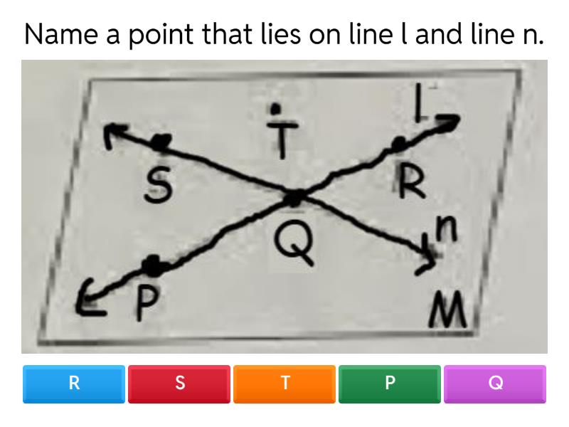1) Name a point that lies on line l and line n. a) R b) S c) T d) P e) Q 2) Name a point that does NOT lie on line n or line l. a) R b) S c) T d) P e) Q 3) Which of the following could NOT be used to name line l. a) b) c) d) e) f) 4) What are two other ways to name line n. a) b) c) d) e) f) 5) What are some of the names of the plane shown here. a) b) PQS c) plane M d) TPS e) l n f) any three non-collinear points on the plane. 6) Name the intersection of line n and line m. a) line n b) B c) C d) A e) M f) D 7) Name the intersection of plane M and plane N. a) line n b) B c) C d) A e) M f) D 8) Name the plane in which point C lies a) Plane M b) Plane N 9) Are points A, B, C, and D coplaner? a) Yes b) No 10) Look at the question on the diagram a) R b) S c) T d) Q
