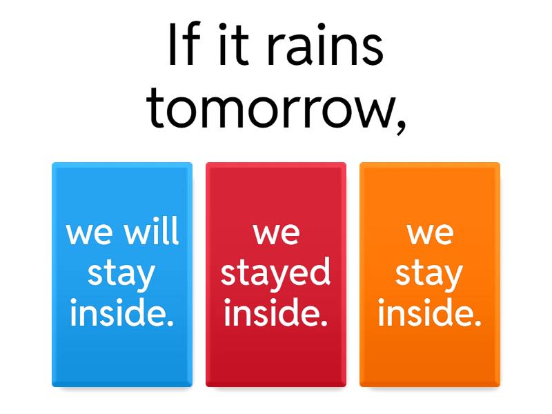 1) If it rains tomorrow, a) we will stay inside. b) we stayed inside. c) we stay inside. 2) If you heat ice, a) it melts. b) it melted. c) it will melt. 3) Will you call me if a) you need help? b) you needed help? c) you will need help? 4) If she doesn't study, a) she will fail. b) she fails. c) she failed. 5) If the sun sets, a) it gets dark. b) it got dark. c) it will get dark. 6) If you mix red and blue, a) you get purple. b) you got purple. c) you will get purple. 7) If he doesn't hurry, a) he will be late. b) he was late. c) he is late. 8) If you don't water plants, a) they die. b) they died. c) they will die. 9) If I find your book, a) I will return it. b) I returned it. c) I return it. 10) If you press this button, a) the light turns on. b) the light turned on. c) the light will turn on.