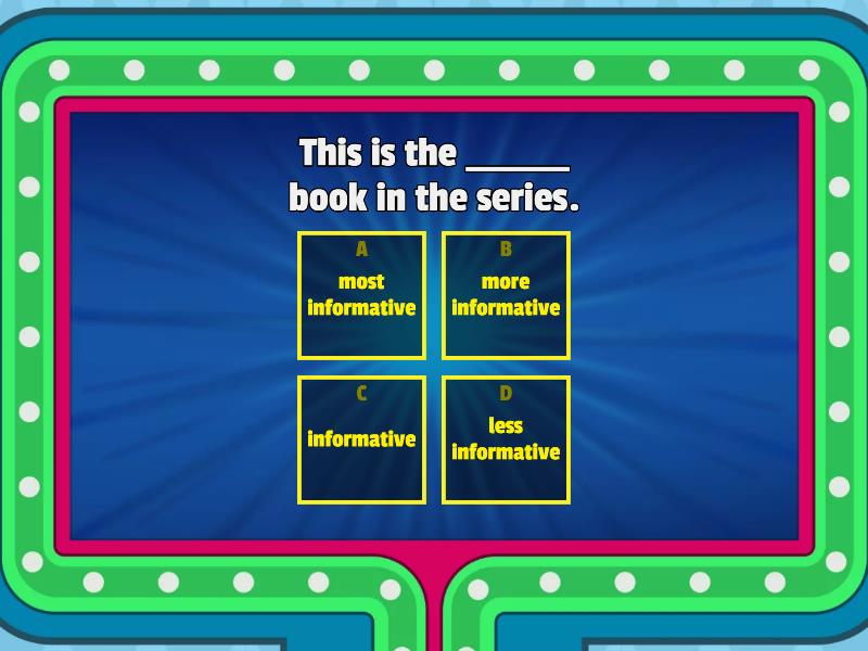 1) This book is ______ than the last one. a) more interesting b) most interesting c) interesting d) less interesting 2) She is the ______ student in the class. a) most intelligent b) more intelligent c) intelligent d) less intelligent 3) This exercise is ______ than the previous one. a) easier b) easy c) easiest d) less easy 4) He is ______ at solving puzzles than his brother. a) better b) best c) good d) less good 5) This is the ______ challenge I had. a) biggest b) bigger c) big d) less big 6) This task is ______ than the last one. a) more challenging b) most challenging c) challenging d) less challenging 7) She is the ______ person I know. a) most creative b) more creative c) creative d) less creative 8) He is ______ at learning languages than I am. a) better b) best c) good d) less good 9) This is the ______ book in the series. a) most informative b) more informative c) informative d) less informative 10) Her progress is ______ than last year. a) faster b) fastest c) fast d) less fast 11) This project is ______ than the previous one. a) more rewarding b) most rewarding c) rewarding d) less rewarding 12) She is ______ at solving problems than her peers. a) better b) best c) good d) less good 13) His ideas are ______ than mine. a) more innovative b) most innovative c) innovative d) less innovative 14) This method is ______ than the old one. a) more effective b) most effective c) effective d) less effective 15) She is ______ at organizing events than before. a) better b) best c) good d) less good 16) This is the ______ solution to the problem. a) best b) better c) good d) less good
