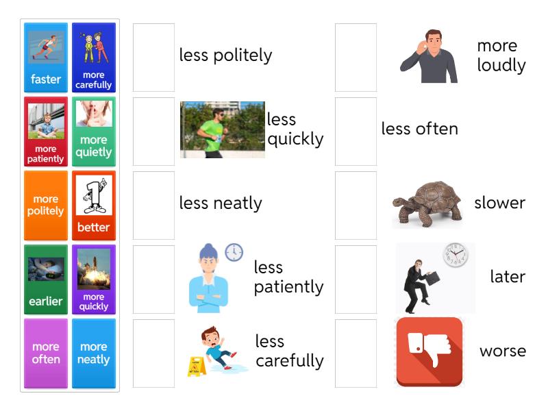 faster - slower, more carefully - less carefully, earlier - later, better - worse, more quietly - more loudly, more often - less often, more patiently - less patiently, more quickly - less quickly, more neatly - less neatly, more politely - less politely,