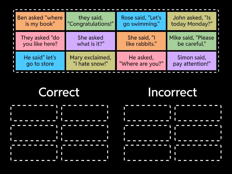 Correct: He asked, "Where are you?", She said, "I like rabbits.", Mary exclaimed, "I hate snow!", Mike said, "Please be careful.", Rose said, "Let's go swimming.", John asked, "Is today Monday?", Incorrect: He said" let's go to store, She asked what is it?", Ben asked "where is my book", Simon said, pay attention!", They asked "do you like here?, they said, "Congratulations!",