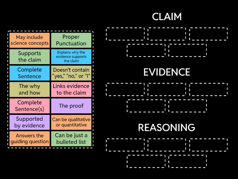 CLAIM: Complete Sentence, Answers the guiding question, Proper Punctuation, Supported by evidence, Doesn't contain "yes," "no," or "I", EVIDENCE: Can be qualitative or quantitative, The proof, Supports the claim, May include science concepts, Can be just a bulleted list, REASONING: Complete Sentence(s), Links evidence to the claim, The why and how, Explains why the evidence supports the claim,