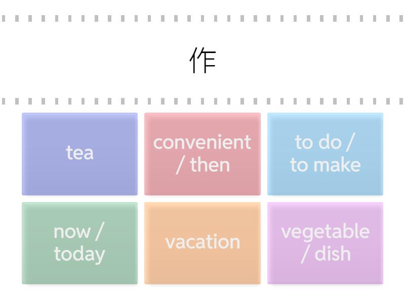 to do / to make - 作, convenient / then - 便, vacation - 假, now / today - 今, vegetable / dish - 菜 , tea - 茶,