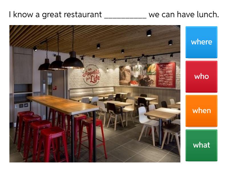 1) I know a great restaurant __________ we can have lunch. a) where b) who c) when d) what 2) Students _______ study hard get good grades. a) which b) whose c) where d) who 3) Food _____ is imported from other countries is expensive. a) which b) where c) what d) who 4) The cookies _________ you baked are really delicious. a) when b) where c) which d) why 5) I visited my uncle ________ lives in a different city. a) who b) whose c) what d) where 6) the movie _____ we saw last week won three awards. a) who b) when c) that d) where e) which 7) He had a feeling __________ something terrible was going to happen. a) that b) when c) who d) which 8) I want to borrow the book _________ you bought last month. a) which b) when c) who d) whose 9) My home is a place _________ I can go to relax every day. a) where b) when c) what d) whose 10) Can you find the teacher ________ you talked to this morning? a) whose b) who c) where d) which