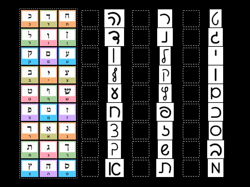 א, ב, ג, ד, ה, ו, ז, ח, ט, י, כ, ך, ל, מ, ם, נ, ן, ס, ע, פ, ף, צ, ץ, ק, ר, ש, ת,