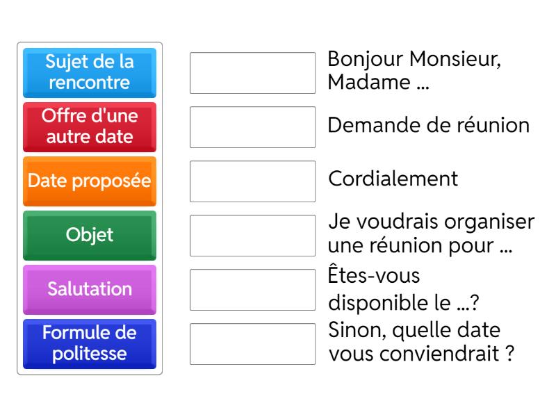 Objet - Demande de réunion , Salutation - Bonjour Monsieur, Madame ..., Sujet de la rencontre  - Je voudrais organiser une réunion pour ... , Date proposée - Êtes-vous disponible le ...?, Offre d'une autre date - Sinon, quelle date vous conviendrait ?, Formule de politesse  - Cordialement,