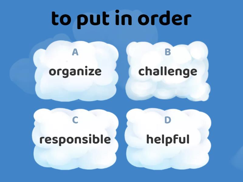 1) something two or more people work on together a) project b) focus c) collaboration d) organize 2) an activity people work on a) project b) helpful c) challenge d) collaboration 3) completed something with good results a) patient b) misunderstanding c) successful d) project 4) not in a hurry a) respectful b) patient c) helpful d) compromise 5) not easy a) organize b) difficult c) patient d) successful 6) to give your attention to one thing a) focus b) compromise c) organize d) collaboration 7) to be polite or admire someone and show patience and understanding a) respectful b) organize c) compromise d) plan 8) ready or willing to give help a) challenge b) helpful c) suggestion d) successful 9) to do things that you are supposed to do a) successful b) focus c) responsible d) organize 10) to put in order a) responsible b) organize c) challenge d) helpful 11) ideas or steps for an activity or project a) compromise b) focus c) plan d) responsible 12) something difficult or a problem a) patient b) compromise c) responsible d) challenge 13) a view or judgement about something a) successful b) opinion c) patient d) misunderstanding 14) when someone does not understand correctly a) style b) plan c) challenge d) misunderstanding 15) able to notice small changes or feelings a) helpful b) sensitive c) organize d) collaboration 16) advice a) responsible b) difficult c) suggestion d) plan 17) an agreement between two people that have different opinions a) sensitive b) compromise c) style d) focus 18) a way of doing something a) successful b) compromise c) misunderstanding d) style 19) a disagreement or argument between people a) suggestion b) responsible c) helpful d) conflict 20) team a) group of people working together b) party of dogs c) your cats wanting food d) everyone but you