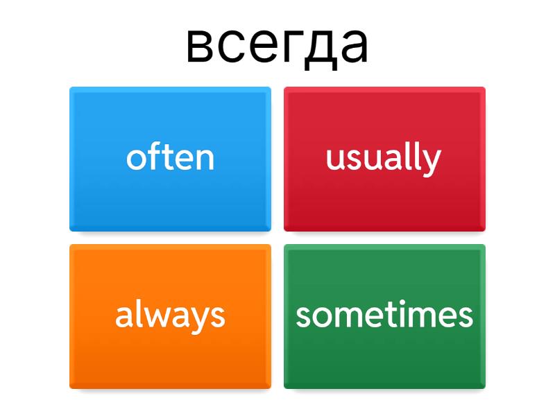 1) всегда a) often b) usually c) always d) sometimes 2) обычно a) often b) sometimes c) rarely (seldom) d) usually 3) часто a) sometimes b) often c) usually d) always 4) иногда a) usually b) often c) always d) sometimes 5) никогда a) never b) sometimes c) usually d) always 6) редко a) often b) usually c) never d) rarely (seldom)