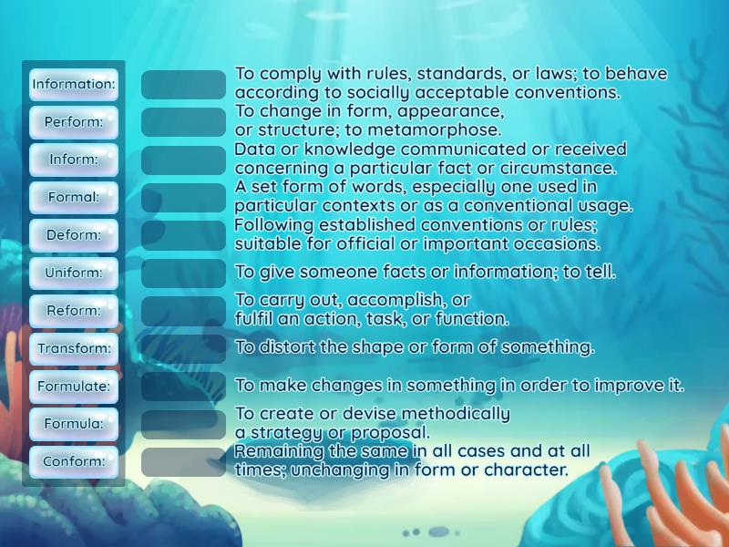 Inform: - To give someone facts or information; to tell., Information: - Data or knowledge communicated or received concerning a particular fact or circumstance., Formal: - Following established conventions or rules; suitable for official or important occasions., Deform: - To distort the shape or form of something., Transform: - To change in form, appearance, or structure; to metamorphose., Formula: - A set form of words, especially one used in particular contexts or as a conventional usage., Reform: - To make changes in something in order to improve it., Conform: - To comply with rules, standards, or laws; to behave according to socially acceptable conventions., Perform: - To carry out, accomplish, or fulfil an action, task, or function., Uniform: - Remaining the same in all cases and at all times; unchanging in form or character., Formulate: - To create or devise methodically a strategy or proposal.,