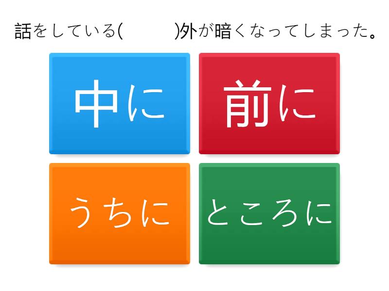 1) 話をしている(   )外が暗くなってしまった。 a) 中に b) 前に c) うちに d) ところに 2) もし(   )とんで国へ帰りたい。 a) 鳥のうちに b) 鳥なのに c) 鳥だから d) 鳥だったら 3) 休む場合はかならず連絡(   )ならない。 a) すれば b) しなければ c) しては d) しないなら 4) 今日は学校に行かないでうちで(   )つもりです。 a) 休んだ b) 休もう c) 休む d) 休まない 5) 天気予報によると、明日はあつい(   )です。 a) つもり b) はず c) ばかり d) そう 6) 雪(   )ため、車の事故がたくさん起きているそうです。 a) だ b) で c) に d) の 7) 彼女を(   )つもりはなかったのですが… a) なかれる b) なかせる c) なかされる d) なかない 8) 結婚する(   )お金をためています。 a) あとで b) なら c) ために d) とき 9) この子は子ども(   )そだてたいです。 a) みたい b) らしく c) のよう d) ばかりに 10) この町はこれからもっと変わって(   )。 a) いきましたね b) いくでしょうね c) きましたね d) きたでしょうね 11) たくさん食べたらおなかが(   )。だから休みます。 a) いたくします b) いたくしました c) いたくなります d) いたくなりました