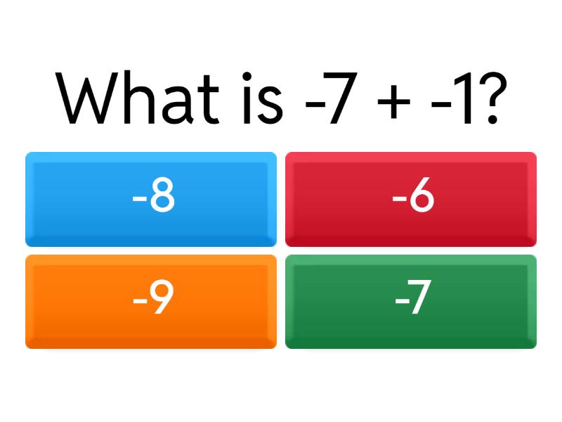 1) What is -7 + -1? a) -8 b) -6 c) -9 d) -7 2) What is -33 ÷ -3? a) -11 b) 11 c) 9 d) -9 3) What is -4 - -8? a) -12 b) -4 c) 4 d) 12 4) What is -54 ÷ -6? a) 9 b) -9 c) 6 d) -6 5) What is -3 × -2? a) 5 b) -6 c) -5 d) 6 6) What is -4 × -5? a) -20 b) 20 c) 15 d) -15 7) What is -3 + -3? a) -6 b) 6 c) -5 d) 5 8) What is 4 × -4? a) 12 b) 16 c) -12 d) -16 9) What is -3 - -4? a) 1 b) -1 c) -7 d) 7 10) What is 100 ÷ -10? a) 10 b) 5 c) -5 d) -10 11) What is -5 - -7? a) -2 b) 12 c) -12 d) 2 12) What is -6 - -2? a) -8 b) 3 c) -4 d) 8 13) What is -4 + -8? a) 12 b) -12 c) -4 d) 4 14) What is -10 - -15? a) 5 b) -5 c) -25 d) 25