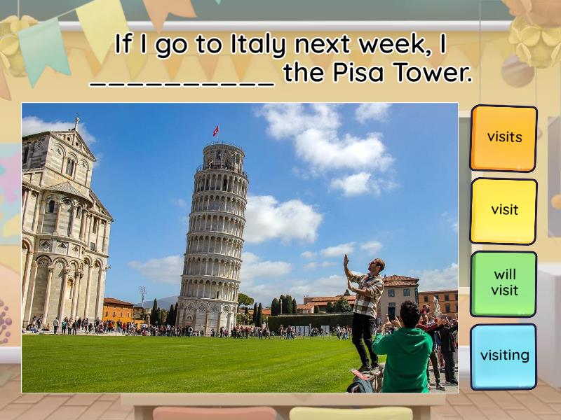 1) If I go to Italy next week, I __________ the Pisa Tower. a) visits b) visit c) will visit d) visiting 2) You will fail the exam if you __________ too much time on your phone. a) spend b) spends c) spent d) will spend 3) She _____________ sad if you forget her birthday. a) be b) will be c) is d) being 4) If we _________________ to the music too loud, everyone will wake up. a) listens b) listened c) listen d) will listen 5) If Spongebob _____________________, he will miss the breakfast. a) don't get up b) will not get up c) didn't get up d) doesn't get up
