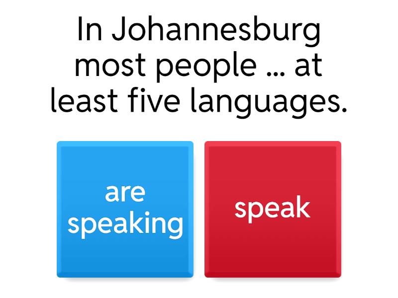1) In Johannesburg most people ... at least five languages. a) are speaking b) speak 2) Languages ... very fast. Half of world's languages will disappear by 2100. a) disapper b) are disappearing 3) You can't see Tim now; he ... a bath. a) 's having b) has 4) Please keep quiet, I ... to the radio. You know I ... to the news in the mornings. a) 'm listening, listen b) listen, 'm listening 5) What time ... ? a) is the first train leaving b) does the first train leave 6) I finished watching the series you recommended. Now I ... another one. a) watch b) 'm watching 7) What ... tonight? Would you like to come and watch the game? a) do you do b) are you doing 8) Nobody ... they will win the match. a) is thinking b) thinks 9) You look worried. What ... ? a) do you think b) are you thinking 10) I ... a scarf, but today I ... one because it's unusually cold. a) never wear, 'm wearing b) 'm never wearing, wear