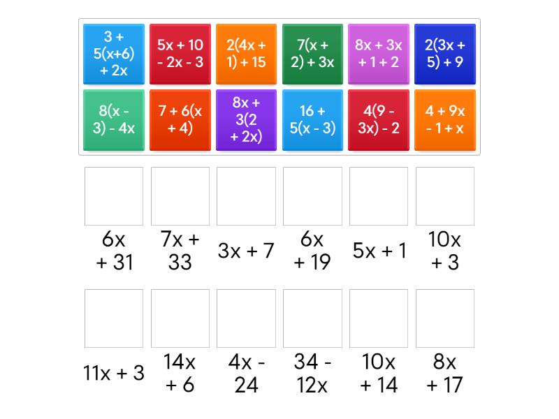 7(x + 2) + 3x - 10x + 14, 2(3x + 5) + 9 - 6x + 19, 2(4x + 1) + 15 - 8x + 17, 16 + 5(x - 3) - 5x + 1, 8x + 3(2 + 2x) - 14x + 6, 8(x - 3) - 4x - 4x - 24, 3 + 5(x+6) + 2x - 7x + 33, 4(9 - 3x) - 2 - 34 - 12x, 7 + 6(x + 4) - 6x + 31, 5x + 10 - 2x - 3 - 3x + 7, 4 + 9x - 1 + x - 10x + 3, 8x + 3x + 1 + 2 - 11x + 3,