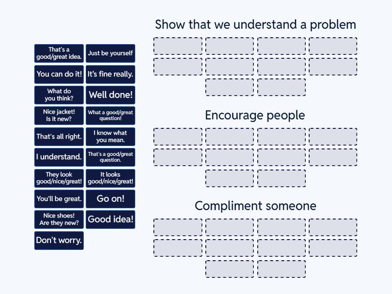 Show that we understand a problem: That’s all right., I understand., I know what you mean., It's fine really., Encourage people: You can do it!, You’ll be great., Just be yourself, What a good/great question!, That’s a good/great idea., That’s a good/great question., What do you think?, Go on!, Don’t worry., Good idea!, Compliment someone: Nice jacket! Is it new?, It looks good/nice/great!, Nice shoes! Are they new?, They look good/nice/great!, Well done!,