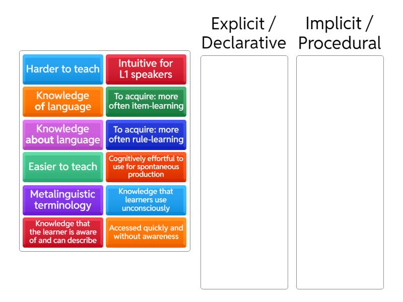 Explicit / Declarative: Knowledge about language, Knowledge that the learner is aware of and can describe, Easier to teach, Metalinguistic terminology, Cognitively effortful to use for spontaneous production, To acquire: more often item-learning, Implicit / Procedural: Knowledge of language, Knowledge that learners use unconsciously, Harder to teach, Intuitive for L1 speakers, Accessed quickly and without awareness, To acquire: more often rule-learning,