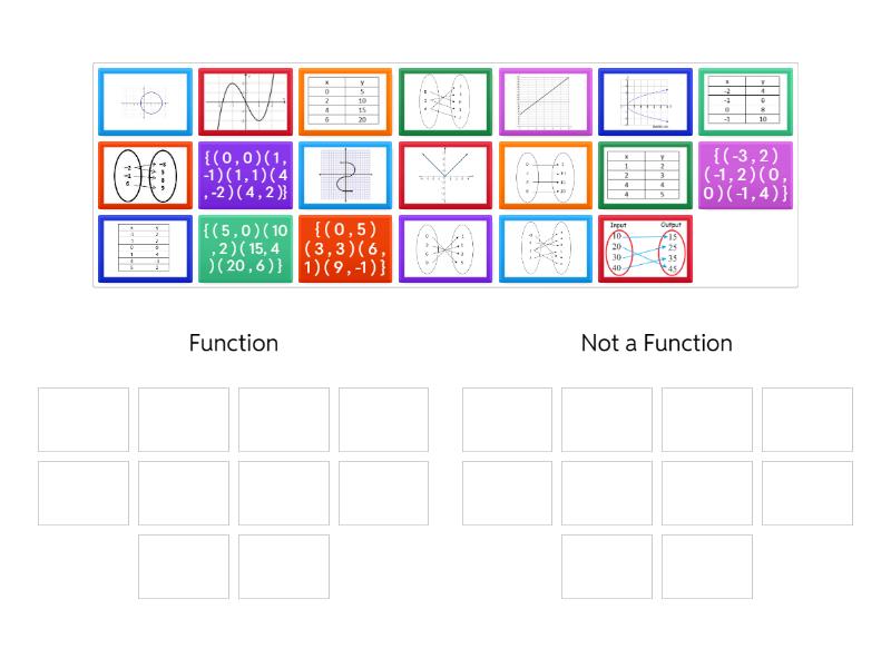 Function: , , { ( 5 , 0 ) ( 10 , 2 ) ( 15, 4 ) ( 20 , 6 ) }, , , { ( 0 , 5 ) ( 3 , 3 ) ( 6 , 1 ) ( 9 , -1 ) }, , , , , Not a Function: , , { ( 0 , 0 ) ( 1 , -1 ) ( 1 , 1 ) ( 4 , -2 ) ( 4 , 2 )}, , , { ( -3 , 2 ) ( -1 , 2 ) ( 0 , 0 ) ( -1 , 4 ) }, , , , ,