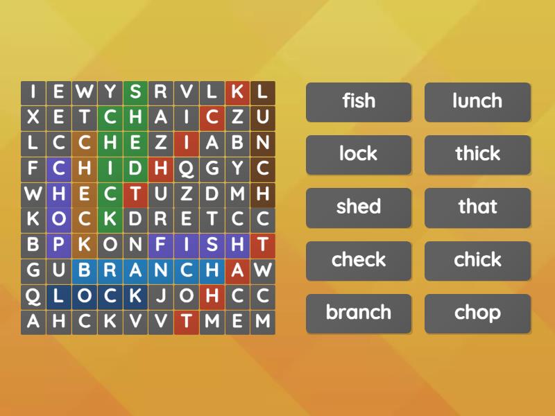 shed - shed, fish - fish, thick - thick, branch - branch, lunch - lunch, lock - lock, check - check, chick - chick, chop - chop, that - that,