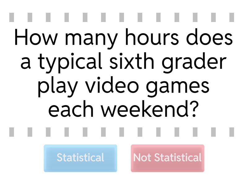 Statistical: How many hours does a typical sixth grader play video games each weekend?, How many states has the average student visited?, What flavor of ice cream does a typical sixth grader prefer?, How many texts does a typical sixth grader send each day?, How many sports does an average sixth grader play?, What subject does a typical sixth grader prefer?, How many hours does the average sixth grader watch TV each night?, How many jelly beans are in a typical bag of jelly beans?, How many letters are in sixth graders' first names?, Not Statistical: How many states are in the United States of America?, In what year did California become a state?, How many moons does Earth have?, What is the height of the tallest roller coaster at Kings Island?, How many lunches did the cafeteria serve yesterday?, How many inches tall is Mrs.Kellams?, How many students earned an A on Friday's math test?, What size shoe does LeBron James wear?,