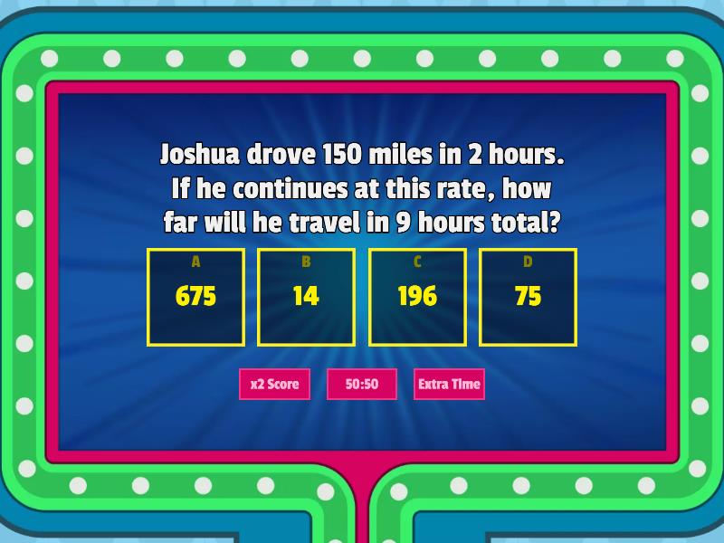 1) Joshua drove 150 miles in 2 hours. If he continues at this rate, how far will he travel in 9 hours total? a) 675 b) 14 c) 196 d) 75 2) Athena works at the railyard snow cone hut. Last Saturday she made 130 snow cones in 2 hours. If she continues at this rate, how many snow cones can she make in 3 hours? a) 5 b) 36 c) Miranda d) 195 3) Hope has a marble collection made up of blue and green marbles from all over the country. She has a ratio of 7 blue marbles for every 12 marbles total. If she has 72 total marbles, how many are green? a) 325 b) 42 c) 675 d) 30 4) There is a ratio of 8 boys for every 14 students at the school dance. If there are a total of 84 students at the dance, how many are girls? a) 36 b) 6 c) 48 d) 675 5) 5 vests can be made from 7 ½ yards of fabric. How many vests can be made from 8 yards of fabric? a) 10 b) 36 c) 14 d) 42 6) Cole uses 12 inches of fabric to make 24 ornaments. How many inches of fabric does he need to make 12 ornaments? a) 56 b) 6 c) 2 d) 24 7) Betsy is planting a new garden. Her newest cactus is 3 ¼ meters tall. How many centimeters is her new cactus? a) 325 b) 3.25 c) 0.325 d) 3,250 8) Ginger had 10 goldfish and 12 guppies in her aquarium. If she increased the number of goldfish to 35, what is the total number of guppies needed to keep the same ratio? a) 30 b) 42 c) 36 d) 4 9) Ben kept track of the cars that went by his house. He saw 3 white cars, 3 yellow cars, 6 green cars, and 5 black cars. What is the ratio of green cars to total cars that ben saw? a) 3:18 b) 6:16 c) 3:17 d) 6:17 10) In Ms. roble’s class of 24 students, there are sixteen boys. WHat is the ratio of girls to boys in ms. Roble’s class? a) 16:24 b) 8:24 c) 1:3 d) 1:2 11) Suppose a car travels 174 miles in 3 hours. How long will it take to travel 290 miles? a) 5 b) 6 c) 5.5 d) 4.5 12) The ratio of boys to girls on the Dartmouth team is exactly 6:8. If there are 84 boys on the team, how many total students are on the Dartmouth team? a) 196 b) 112 c) 14 d) 165 13) During basketball season, Wanda made 1 out of every 3 free throws she attempted. In the last basketball game, wanda attempted 12 free throws. How many free throws would she have been expected to make? a) 4 b) 3 c) 6 d) 4 14) Jason ran exactly 5 miles in 30 minutes. How many miles could he run in 2 hours? a) 20 b) 4 c) 25 d) 3 15) Jimmy uses 12 kilometers of fence to fence his yard. How many meters of fence did he use? a) 1.20 b) 120 c) 12,000 d) 1,200 16) Georgia eats 2 cups of dog food twice a day. How many pints of dog food does georgia eat in one week? a) 21 b) 4 c) 7 d) 14 17) Mel bought 3 pizzas for every 2 students. Miranda bought 5 pizzas for every 3 students. Who gave their students more pizza? a) Miranda b) Mel c) they gave their students the same amount. 18) Mel’s heart beats 120 times every 2 minutes. Miranda’s heart beats 260 times every 4 minutes. Who has the slower heart rate? a) Miranda b) Mel c) they had equal heart rates 19) Derrick walked 141 feet home. How many yards does he walk? a) 423 b) 42 c) 11.75 d) 47 20) Cara ate 3.5 pounds of food on thanksgiving day. How many ounces of food did she eat? a) 28 b) 56 c) 58 d) 14
