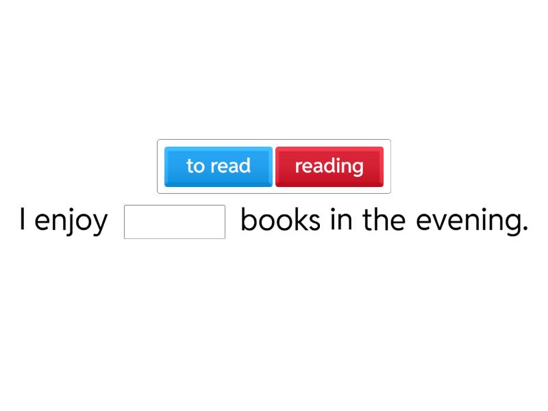 I enjoy ____ books in the evening. She wants ____ to the park. We decided ____ a movie last night. We would like ____ two cheeseburgers, please. I'm learning English ____ at work