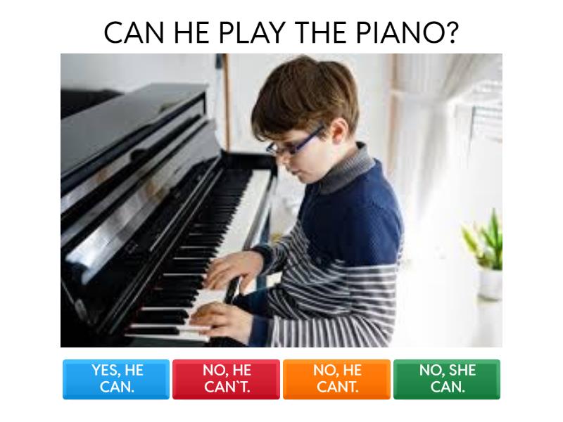 1) CAN HE PLAY THE PIANO? a) YES, HE CAN. b) NO, HE CAN`T. c) NO, HE CANT. d) NO, SHE CAN. 2) CAN SHE BAKE COOKIES? a) YES, SHE CAN. b) NO, SHE CAN`T. c) NO, SHE CANT. d) YES, SHE CANT. 3) CAN THEY SWIM IN THE POOL? a) YES, THEY CAN. b) NO, THEY CAN`T. c) YES, THEY CANT. d) NO, THEY CAN. 4) CAN DONALD DRIVE A CAR? a) YES, HE CAN. b) NO, HE CAN`T. c) YES, HE CANT. d) YES, SHE CAN. 5) CAN EMMA SING? a) YES, SHE CAN. b) NO, SHE CAN`T. c) YES, THEY CAN. d) NO, THEY CANT. 6) CAN MICKEY PAINT? a) YES, HE CAN. b) NO, HE CAN`T. c) YES, IT CAN`T. d) YES, IT COULD. 7) CAN THEY PLAY VIDEO GAMES? a) YES, THEY CAN. b) NO, THEY CAN`T. c) NO, SHE CAN`T. d) YES, SHE CAN. 8) CAN OLIVER RIDE A BICYCLE? a) YES, HE CAN. b) NO, HE CAN`T c) YES, OLIVER CANT. d) NO, SHE CAN. 9) CAN THE CHILDREN JUMP HIGH? a) YES, THEY CAN. b) NO, THEY CAN`T. c) YES, THE CHILDREN CAN`T. d) NO, THEY CAN. 10) CAN RYAN USE A COMPUTER? a) YES, HE CAN. b) NO, HE CAN`T. c) YES, RYAN CAN`T. d) NO, RYAN CAN.