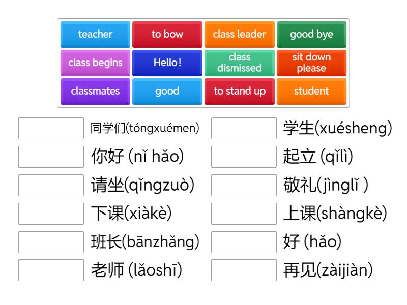 Hello! - 你好 (nǐ hǎo), classmates - 同学们(tóngxuémen), teacher - 老师 (lǎoshī), good - 好 (hǎo), good bye - 再见(zàijiàn), to stand up - 起立 (qǐlì), sit down please - 请坐(qǐngzuò), to bow - 敬礼(jìnglǐ ), class leader - 班长(bānzhǎng), student - 学生(xuésheng), class begins - 上课(shàngkè), class dismissed - 下课(xiàkè),