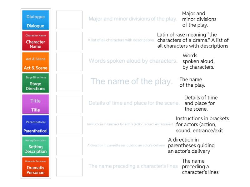 Character Name - The name preceding a character's lines, Title - The name of the play., Stage Directions - Instructions in brackets for actors (action, sound, entrance/exit, Dramatis Personae - Latin phrase meaning "the characters of a drama." A list of all characters with descriptions, Dialogue - Words spoken aloud by characters., Act & Scene - Major and minor divisions of the play., Setting Description - Details of time and place for the scene., Parenthetical - A direction in parentheses guiding an actor's delivery,